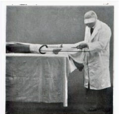 They can be disinfected by fire or water. A couple of transverse bandage slings suspend the limb from the side bars of the knee splint. A straight splint is placed behind the suspensory bandages of the thigh and knee.